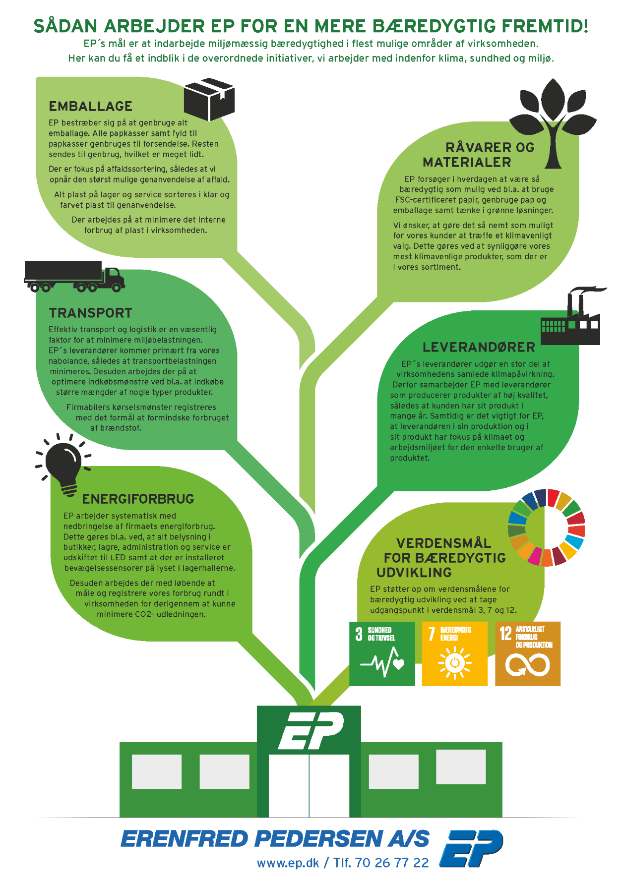 Som erhvervsdrivende i Danmark ønsker EP at tage ansvar, hvorfor vi også er optaget af at kunne bidrage positivt til FN’s Verdensmål for bæredygtig udvikling.Vi har derfor valgt at sætte FN’s Verdensmål på dagsordenen som et strategisk fokus. Vi ønsker med andre ord kontinuerligt at synliggøre og udvikle udvalgte Verdensmål, hvor vi tror på, at kunne gøre størst forskel igennem vores daglige virke.