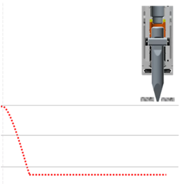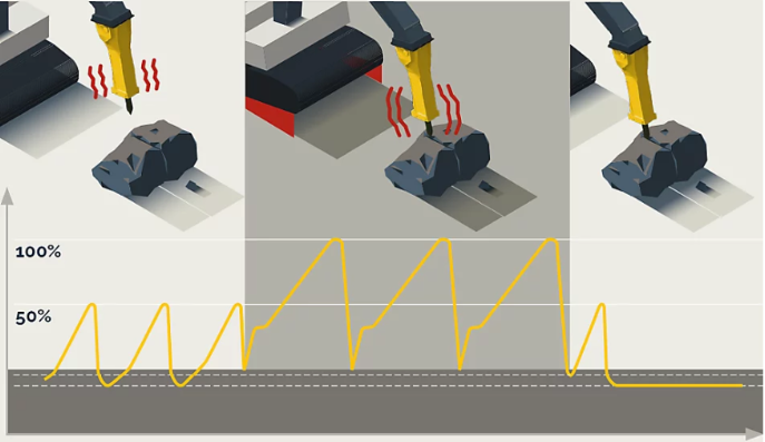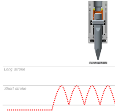 Så snart kontakttrykket mellem mejsel og materiale stiger, begynder stemplet at arbejde i lang slag, og hydraulik hammeren automatisk til AutoStop-tilstand.